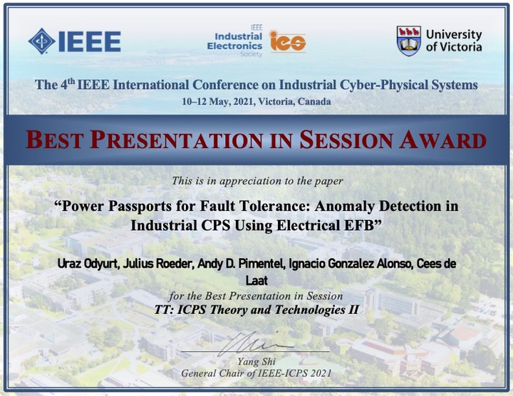 Uraz Odyurt received the Best Presentation in Session Award at IEEE ICPS'21 for his presentation entitled 'Power Passports for Fault Tolerance: Anomaly Detection in Industrial CPS Using Electrical EFB' Uraz Odyurt, Julius Roeder, Andy D. Pimentel, Ignacio G. Alonso, and Cees de Laat Jun 17, 2021