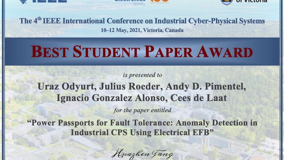 Uraz Odyurt received the Best Student Paper Award at IEEE ICPS'21 for his paper entitled 'Power Passports for Fault Tolerance: Anomaly Detection in Industrial CPS Using Electrical EFB'